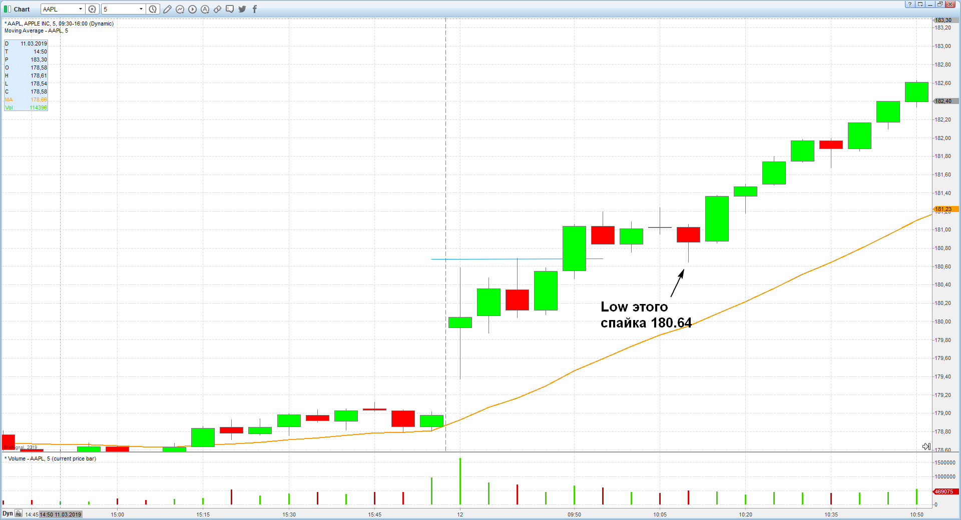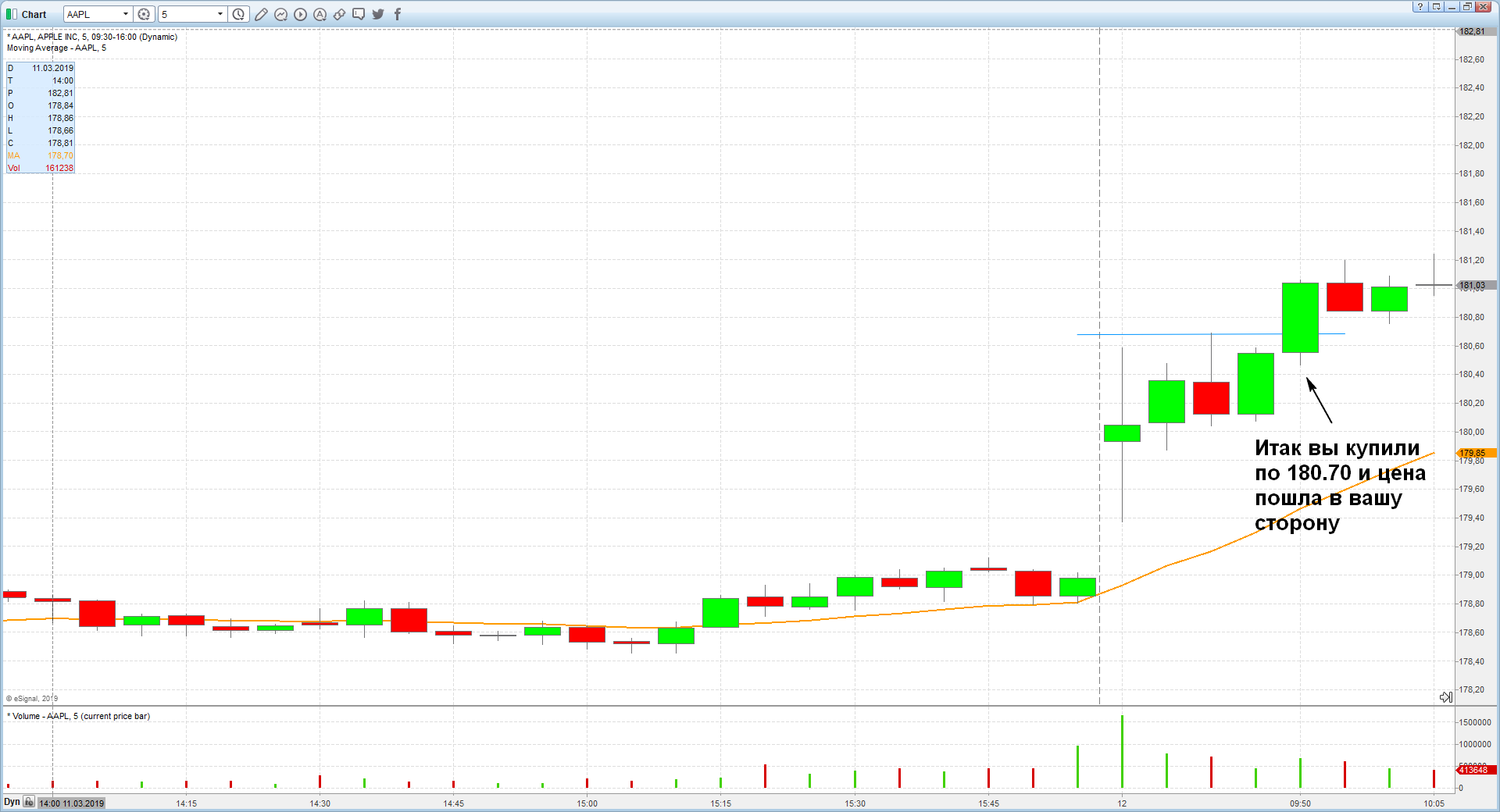 Спайк до 180.64 выбивает трейдера из позиции. И акция идет наверх. Новичок матерится, ругается, но перезаходит ли в позицию заново?