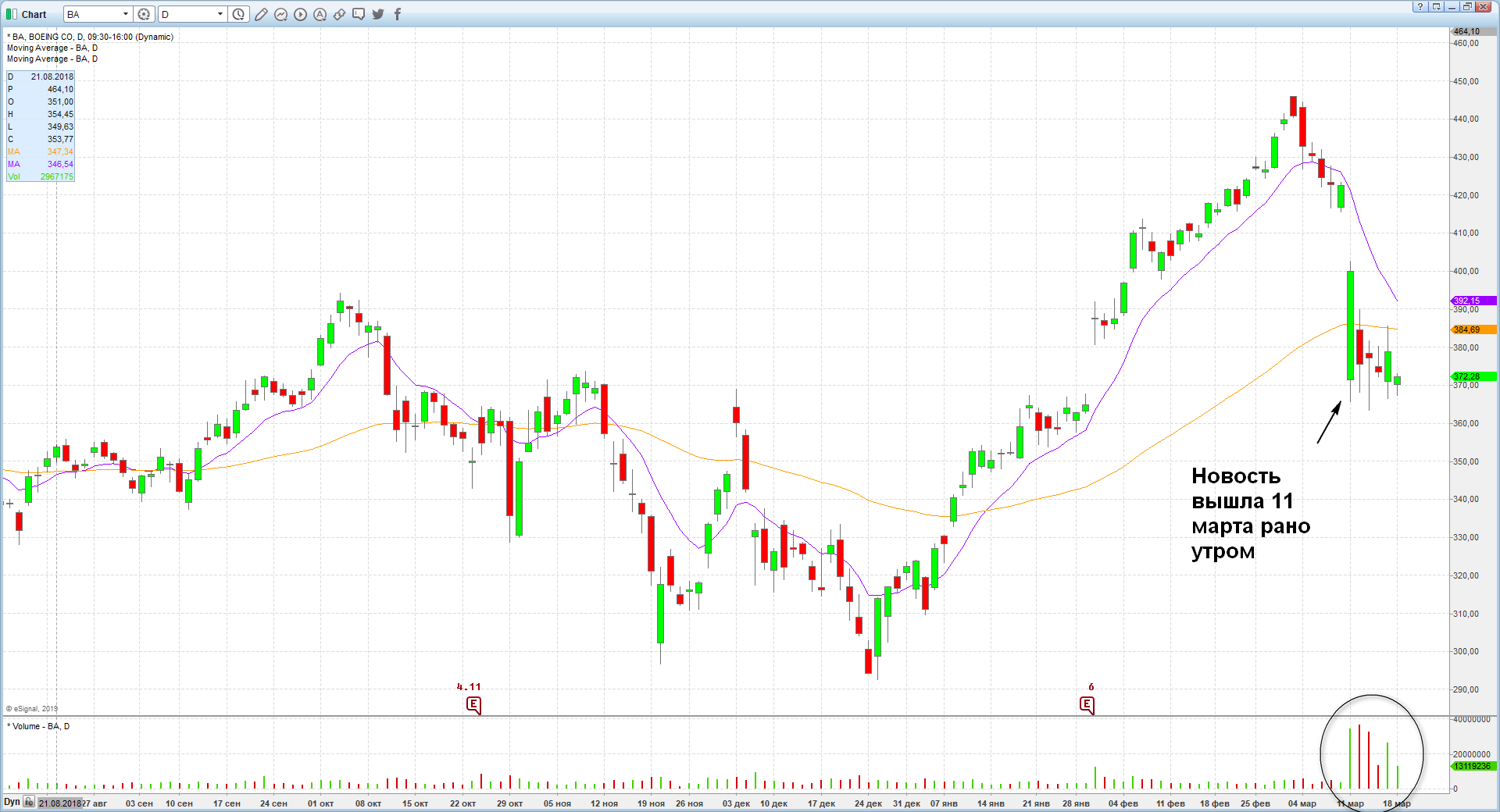 В начале марта 2019г очень горячей акцией на рынке была BA (Boeing). После падения самолетов в Индонезии в октябре 2018г и в Эфиопии в марте 2019г началось расследование, которое идёт по сей день.