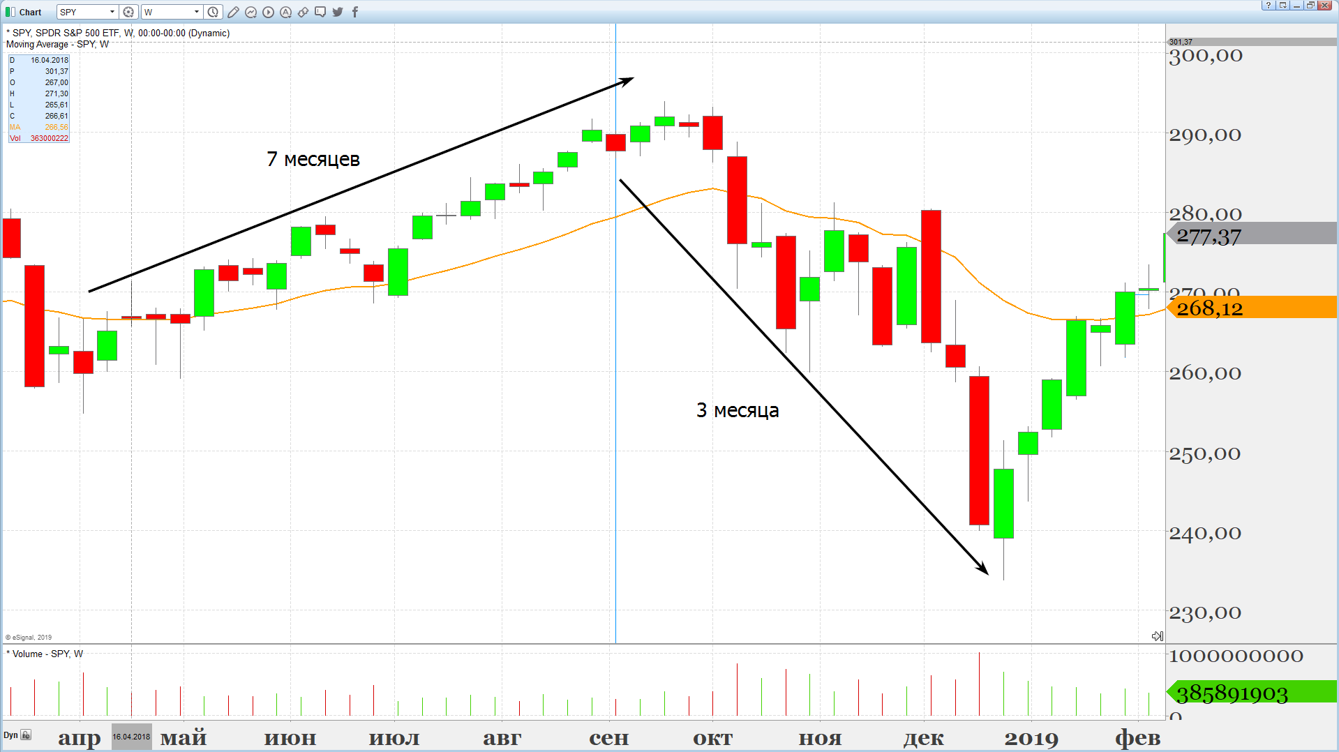 На графике я отметил примеры поведения быков и медведей. Рост за 7 месяцев - он медленный, растет размеренно. И падение в течение 3 месяцев - в 2 раза больше и в 2 раза быстрей.